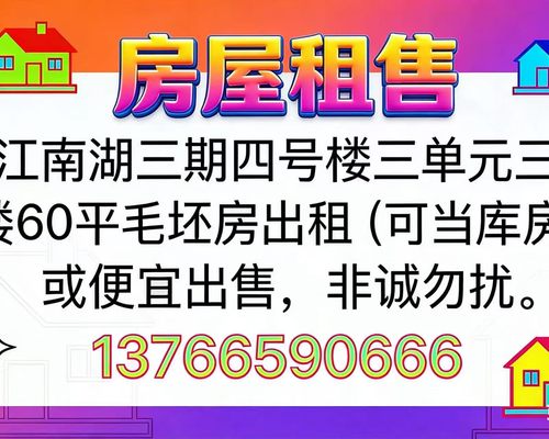 江南湖三期四号楼三单元三楼60平毛坯房出租(可当库房)或便宜出售,非诚勿扰。13766590666